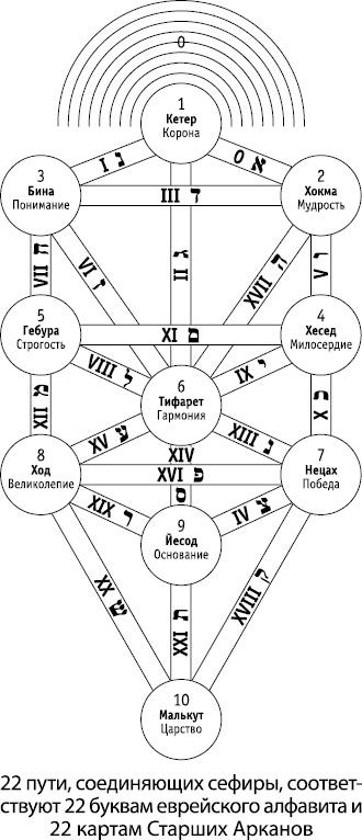 Считая свет божественным, или духовным (Кетер), а тьму — материей (Малькут), в которую падает искра божья, мы видим две отдельные половины целого, стремящиеся вернуть друг другу священную идею творения, то самое напряжение полюсов, на котором держится весь физический мир, говоря современным языком, — ту самую «модель восприятия», которая позволяет нам интерпретировать реальность. Искра света, упавшая со своих вершин на самый низкий уровень материального, естественным образом стремится вернуться к Богу. Мы же находимся почти на середине Древа Жизни, где-то между его корнями и макушкой, осуществляя взаимодействие света и тьмы в ходе творения. Для каббалиста история Творения не является ни выдумкой, ни подлинной реальностью. Древо Жизни для него — лишь своеобразная карта или «расписание» движения энергии, помогающее запечатлеть непознаваемое. Знатоки каббалы, скорее всего под влиянием Пифагора, полагали, что познать непознаваемое можно только с помощью крайней абстракции, к которой наиболее близки цифры. На Древе Жизни «предельная реальность» изображена в виде десяти кругов (сефир, или сефирот), которые не складываются в какое-то одно общее утверждение, а скорее описывают определенные циклы, основывающиеся друг на друге. Каждый из них становится понятным лишь после того, как пройдены предыдущие уровни. Каббала — это не просто философско-религиозное учение, это модель Вселенной, вписанная в еврейскую традицию. Элементы этой модели мы впервые находим у Пифагора. Основные понятия о ней содержатся также в восточном учении об эманациях. Известный французский эзотерик, автор лучших книг о каббале и одной из самых противоречивых книг о Таро, Папюс писал: «Каббала — это наука о душе и Боге, а также об отношениях между ними. Она учит и доказывает, что все есть в одном и одно — во всем».