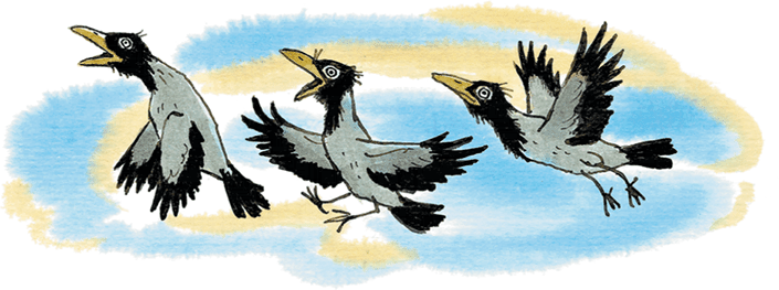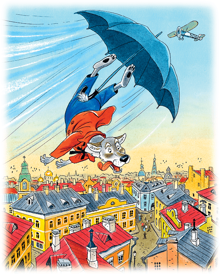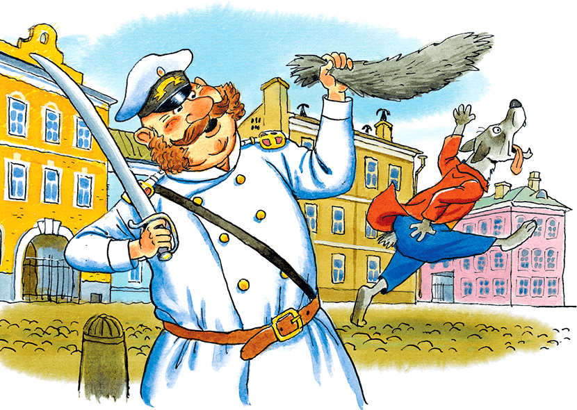 Поточил свою саблю о камень – чирк! чирк! – и отрубил волку хвост, а чтобы кровь не текла, залепил анг-лийским пластырем. Заплакал волк и побежал домой, но хвоста у него нет, и такой он без хвоста смешной: смот-рят все и смеются. А городовой хвост спрятал и потом сделал из него щётку, чтобы чистить стёкла у ламп.