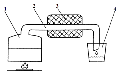 Рис. 1. 1. Сосуд с брагой. 2. Трубка-змеевик. 3. Сосуд с водой. 4. Сосуд для сбора самогона