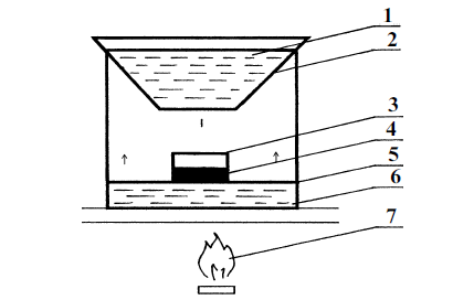 Рис. 2. 1. Холодная вода. 2. Тазик. 3. Миска для сбора самогона. 4. Самогон. 5. Кастрюля для браги. 6. Брага. 7. Нагреватель.