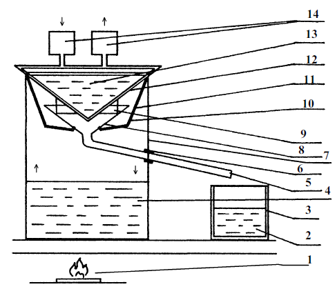 Рис. 3. 1. Нагреватель. 2. Самогон. 3. Посудина для сбора самогона. 4. Брага. 5. Трубка. 6. Кусок трубы. 7. Посудина. 8. Проволочная корзина. 9. Воронка. 10. Пластина. 11. Замазка. 12. Холодильник. 13. Вода. 14. Подвод и отвод воды для холодильника.