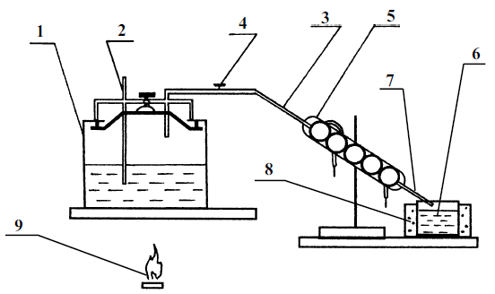 В одну дырку ввинчен термометр, в другую – предохранительный клапан, а в третью – длинная трубка, завитая спиралью (змеевик). Змеевик проходит через посудину с обычной холодной водой (холодильник).
