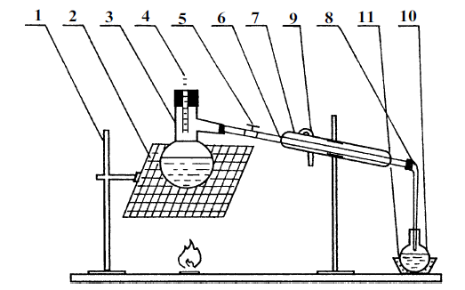 Рис. 5,1. Штатив. 2. Асбестовое сито. 3. Сосуд с жидкостью. 4. Термометр. 5. Кран. 6. Соединительная трубка. 7. Холодильник. 8. Трубки для охлаждения жидкости. 9. Выток. 10. Сосуд с продуктом. 11. Водяная баня.