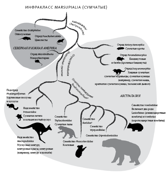 Генеалогическое древо для коал с названиями и иллюстрациями представителей рода. Вымершие группы выделены серым цветом.