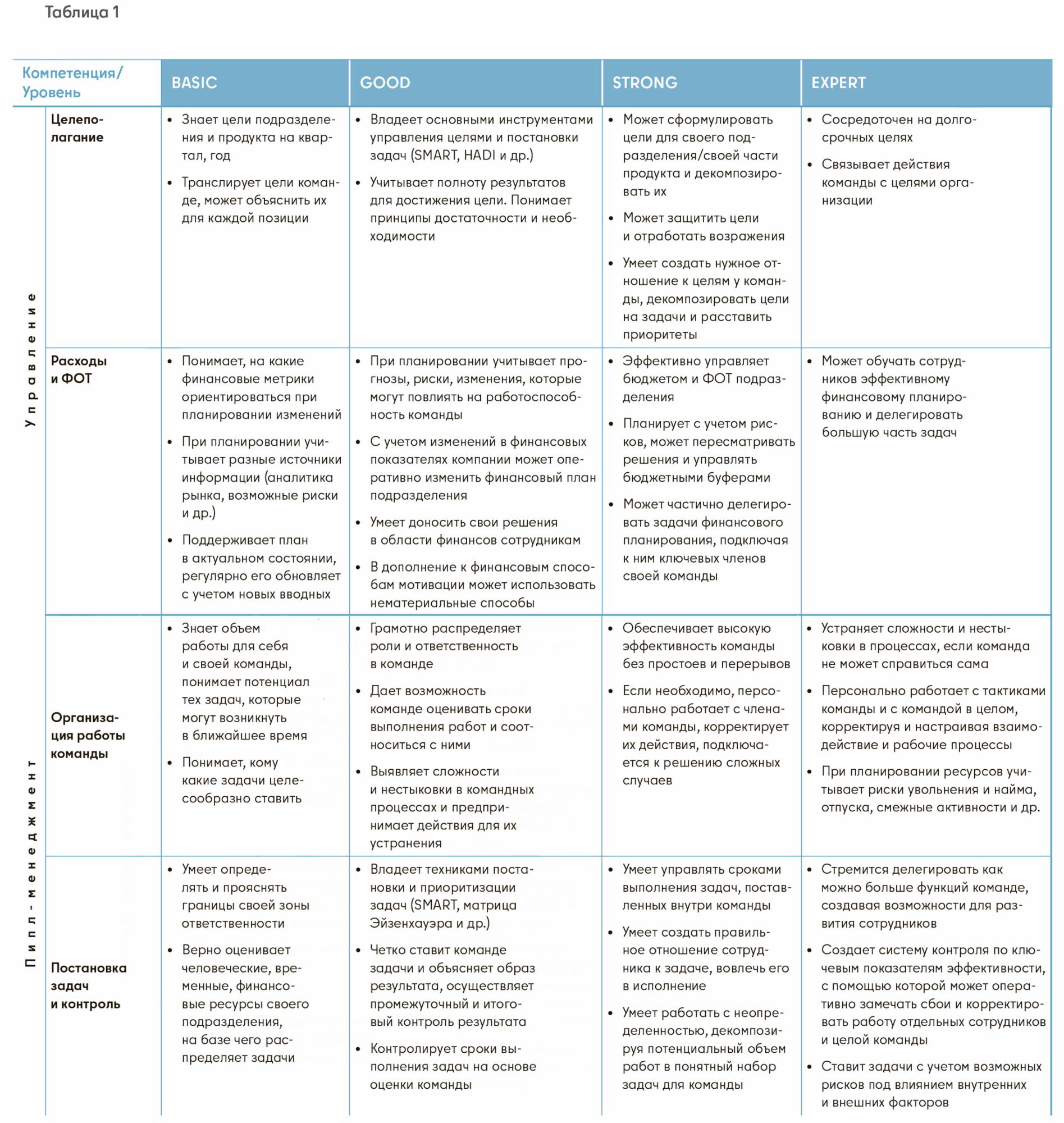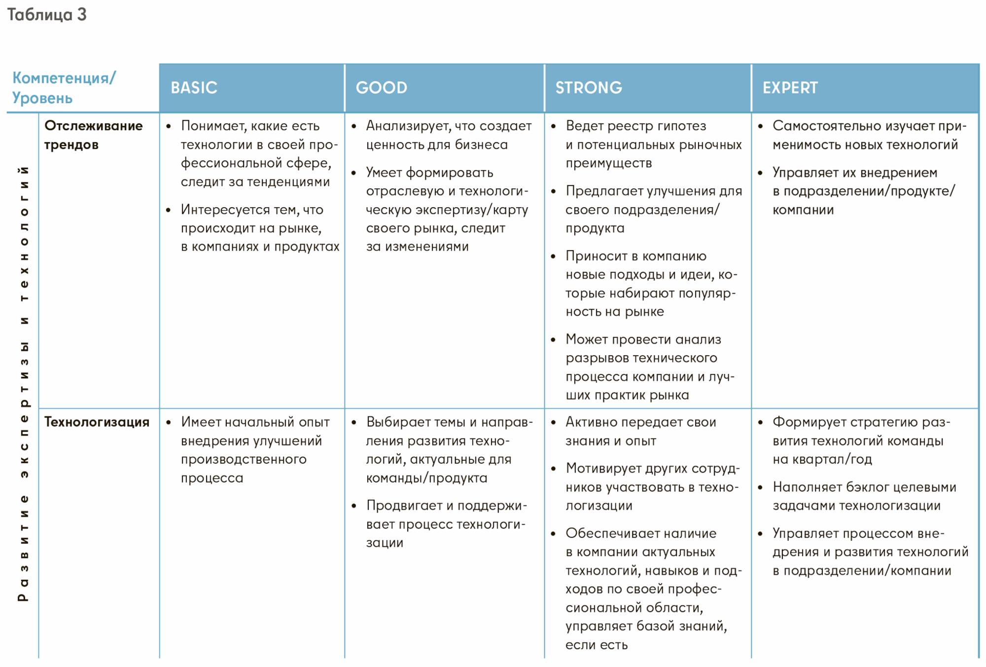 В нашем варианте для каждой компетенции даны описания четырех уровней мастерства — от базового до экспертного, каждому уровню соответствуют проверочные поведенческие индикаторы.