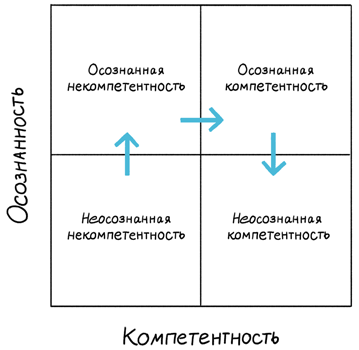 Неосознанная компетентность. У вас уже достаточно опыта решения разных задач в этой области, особенно нестандартных. Навык доведен до автоматизма, так что вы справляетесь интуитивно, по привычке. На этой стадии уже пора самому учить других.