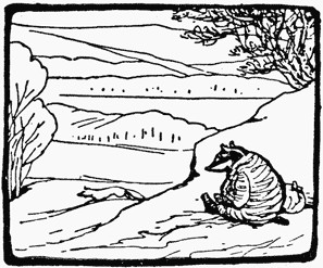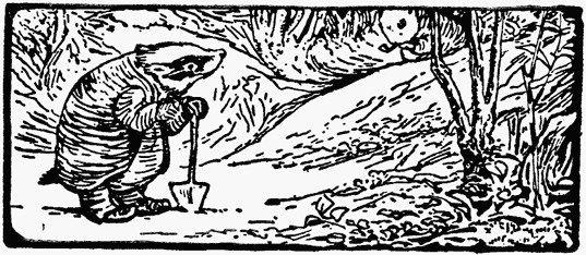 He sat in the sun, and conversed cordially with Tommy Brock, who was passing through the wood with a sack and a little spud which he used for digging, and some mole traps. He complained bitterly about the scarcity of pheasants' eggs, and accused Mr. Tod of poaching them. And the otters had cleared off all the frogs while he was asleep in winter—"I have not had a good square meal for a fortnight, I am living on pig-nuts. I shall have to turn vegetarian and eat my own tail!" said Tommy Brock.