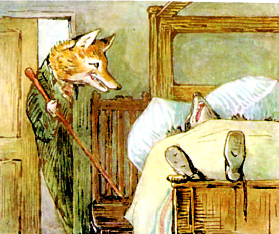 For the next twenty minutes Mr. Tod kept creeping cautiously into the house, and retreating hurriedly out again. By degrees he ventured further in—right into the bedroom. When he was outside the house, he scratched up the earth with fury. But when he was inside—he did not like the look of Tommy Brock's teeth.