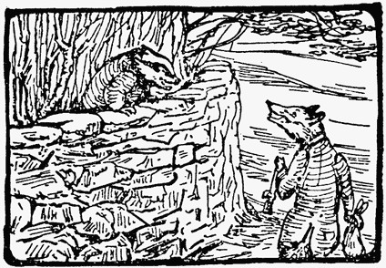Then the snarling and worrying went on outside; and they rolled over the bank, and down hill, bumping over the rocks. There will never be any love lost between Tommy Brock and Mr. Tod.