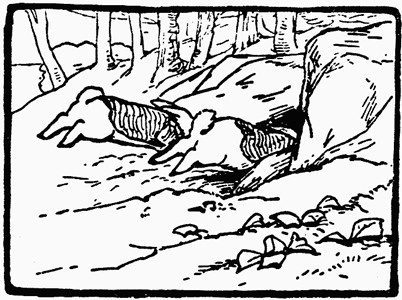 "My Uncle Bouncer has displayed a lamentable want of discretion for his years;" said Peter reflectively, "but there are two hopeful circumstances. Your family is alive and kicking; and Tommy Brock has had refreshment. He will probably go to sleep, and keep them for breakfast." "Which way?" "Cousin Benjamin, compose yourself. I know very well which way. Because Mr. Tod was at home in the stick-house he has gone to Mr. Tod's other house, at the top of Bull Banks. I partly know, because he offered to leave any message at Sister Cottontail's; he said he would be passing." (Cottontail had married a black rabbit, and gone to live on the hill).