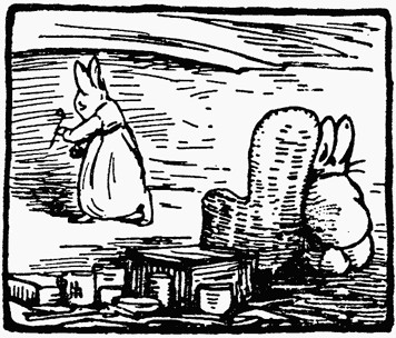 Mr. Bouncer would not confess that he had admitted anybody into the rabbit hole. But the smell of badger was undeniable; and there were round heavy footmarks in the sand. He was in disgrace; Flopsy wrung her ears, and slapped him.