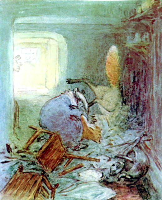 Then Mr. Tod rushed upon Tommy Brock, and Tommy Brock grappled with Mr. Tod amongst the broken crockery, and there was a terrific battle all over the kitchen. To the rabbits underneath it sounded as if the floor would give way at each crash of falling furniture.