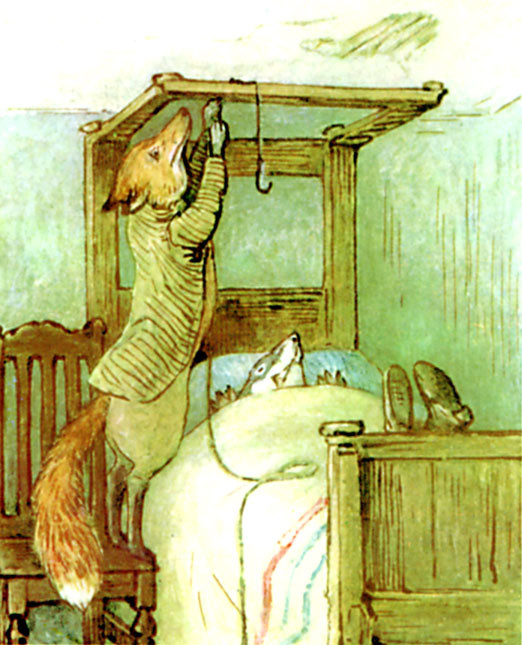 Mr. Tod came back yet again into the bedroom with a clothes line. He stood a minute watching Tommy Brock and listening attentively to the snores. They were very loud indeed, but seemed quite natural.
