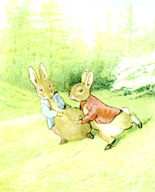 Five minutes afterwards two breathless rabbits came scuttering away down Bull Banks, half carrying half dragging a sack between them, bumpetty bump over the grass. They reached home safely and burst into the rabbit hole.
