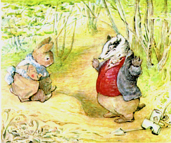So old Mr. Bouncer laughed; and pressed Tommy Brock to come inside, to taste a slice of seed-cake and "a glass of my daughter Flopsy's cowslip wine." Tommy Brock squeezed himself into the rabbit hole with alacrity.