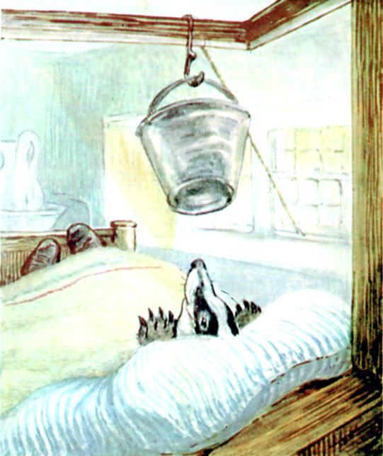 Mr. Tod descended safely from the chair, and endeavoured to get up again with the pail of water. He intended to hang it from the hook, dangling over the head of Tommy Brock, in order to make a sort of shower-bath, worked by a string, through the window.