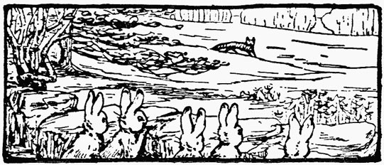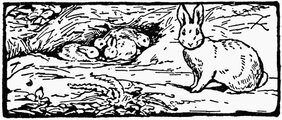 The sunshine was still warm and slanting on the hill pastures. Half way up, Cottontail was sitting in her doorway, with four or five half-grown little rabbits playing about her; one black and the others brown.