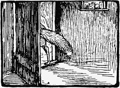 He peeped through the hinges of the half-open bedroom door. Then he turned and came out of the house in a hurry. His whiskers bristled and his coat-collar stood on end with rage.