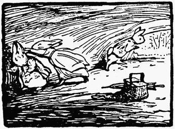 Great was old Mr. Bouncer's relief and Flopsy's joy when Peter and Benjamin arrived in triumph with the young family. The rabbit-babies were rather tumbled and very hungry; they were fed and put to bed. They soon recovered.