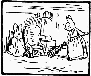 Old Mr. Bouncer, very sulky, was huddled up in a corner, barricaded with a chair. Flopsy had taken away his pipe and hidden the tobacco. She had been having a complete turn out and spring-cleaning, to relieve her feelings. She had just finished. Old Mr. Bouncer, behind his chair, was wondering anxiously what she would do next.