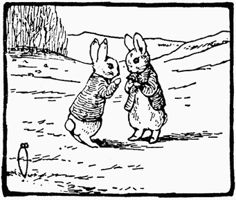 Benjamin climbed over the wall, into a meadow. He found another mole trap newly set; he was still upon the track of Tommy Brock. It was getting late in the afternoon. Other rabbits were coming out to enjoy the evening air. One of them in a blue coat by himself, was busily hunting for dandelions.—"Cousin Peter! Peter Rabbit, Peter Rabbit!" shouted Benjamin Bunny.