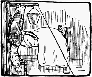 But no screams. Mr. Tod was mystified; he sat quite still, and listened attentively. Then he peeped in at the window. The water was dripping from the bed, the pail had rolled into a corner.