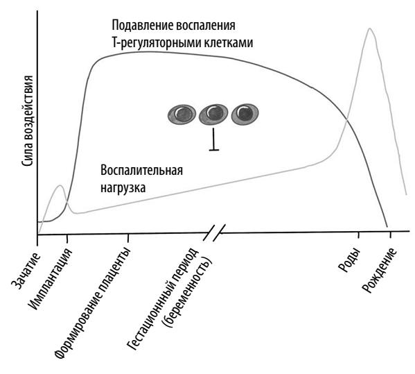 Т-регуляторные клетки играют важнейшую роль в контроле воспаления на ранних сроках беременности. Нарушение баланса между про- и противовоспалительными медиаторами служит отличительной чертой нарушения имплантации. Именно Т-регуляторные клетки осуществляют переход к противовоспалительному фону, необходимый для имплантации и развития плаценты.