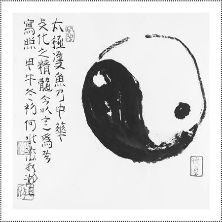 Эту работу выполнил специально для «Красоты физики» Хэ Шуйфа, современный мастер традиционного китайского искусства и каллиграфии, известный энергией и нежностью своей кисти и духовной глубиной образов природы, цветов и птиц. Перевод надписи звучит примерно так: «Двойная рыбка тайцзи — это сущность китайской культуры. Этот рисунок выполнил Хэ Шуйфа у озера в начале зимы».
