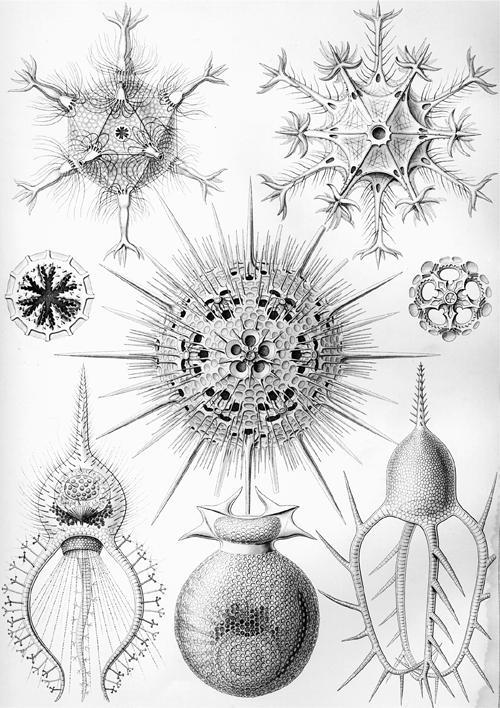 Илл. 8. Радиолярии становятся видимыми под объективом самого простого микроскопа. Их экзоскелеты часто демонстрируют симметрию платоновых тел.