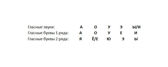 Гласные буквы составляют пары А-Я, О-Ё, У-Ю, Э-Е, Ы-И, каждая пара в сочетаниях с согласными обозначают один и тот же гласный звук – его мягкую и твердую разновидности, например: сад – сядь, вол – вёл.