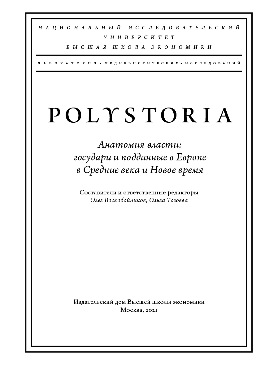 В любом случае в наши задачи не входило определение места М.А. Бойцова в историографии, оно и так ни для кого не является секретом. Мы попытались, следуя за ним, как Данте за Вергилием, представить власть эпохи Средневековья и раннего Нового времени во всей неоднозначности ее проявлений, как сложный организм, существующий на протяжении долгих веков на широком географическом горизонте: от Руси и Византии до Пиренеев, Исландии и Южной Америки. А поскольку феномен власти неописуем в рамках какой-то одной проблематики или методологии, столь же широким нам видится и ее тематическое поле. Его можно довольно условно разделить на такие «подразделы», как право, символическая коммуникация внутри социума, ритуалы и репрезентация, политические провалы и победы, влияние власти на экономику, институты управления и возникновение государственных должностей, ее центры и периферии, ее отношения с религией, индивидуальное и коллективное ее восприятие, ее исключительные и типичные проявления, наконец, проблемы «властного» мифотворчества. Ко всем этим сюжетам примыкают источниковедческие и историографические аспекты изучения феномена «потестарности».