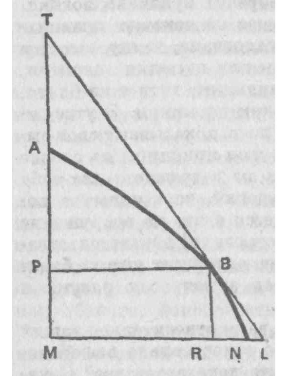 — Следовательно, для того чтобы выяснить это положение, предположим, например, что надо провести касательную к параболе, и рассмотрим решение этой задачи при помощи бесконечно малых дифференциалов. Пусть АВ — кривая, абсцисса АР = х, ордината РВ = у, приращение абсциссы PM = dx, приращение ординаты RN = dy. Теперь допустим, что кривая представляет собой многоугольник и, следовательно, BN, то есть приращение (разность кривой), является отрезком прямой, совпадающим с касательной, а дифференциальный треугольник BRN подобен треугольнику ТРВ. Тогда подкасательная РТ будет определяться из пропорции RN: RB = РВ: РТ, то есть dy: dx = y: РТ. Отсюда подкасательная будет равна y dx/dy.