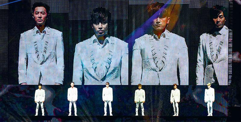 Участники группы Shinhwa во время одного из своих концертов, 5 февраля 2017 года в Тайбэе.