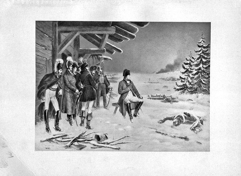 «После сражения при Пултуске, в декабре 1806 [г.], командовавший российскою армиею генерал Беннигсен выступил к нижней Висле с тем, чтобы напасть на маршала принца Понте-Корво (Бернадота), занимавшего Эльбинг. Наполеон оставил Варшаву 15/27 января 1807 [г.], сосредоточил армию в Вилленберге и двинулся на левый фланг русских в намерении опрокинуть их на Фриш-Гаф. Снег и лед покрывали землю. Беннингсенова армия находилась в крайней опасности; уже французская армия достигла до тыла оной, как вдруг казаки схватили офицера Главного штаба принца Невшательского (Бертье). Взятые на нем депеши известили о движении. Беннигсен, испуганный, поспешно стянулся к Алленштейну»[9] и прочее.