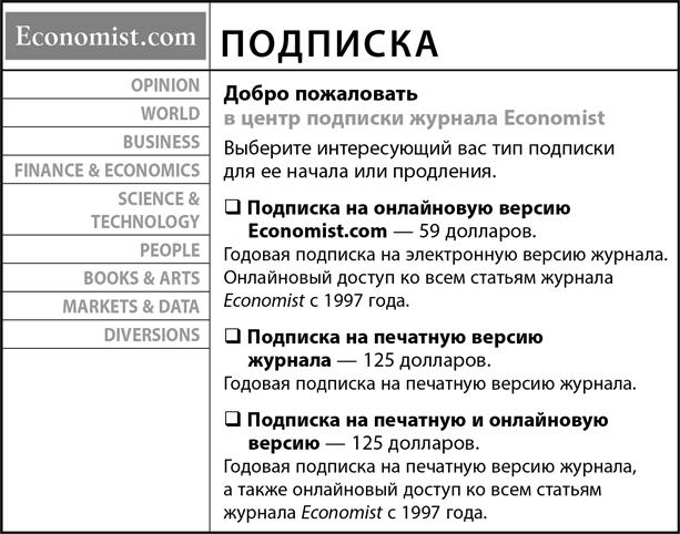 Я внимательно ознакомился с каждым из вариантов. Первое предложение — подписка на интернет-издание за 59 долларов — показалось мне вполне разумным. Второй вариант — подписка на печатное издание за 125 долларов — был несколько дорогостоящим, но тоже рациональным.