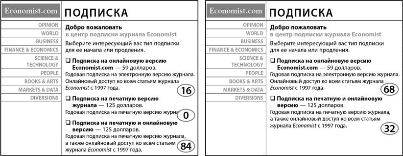 Но затем я увидел третий вариант: двойная подписка на печатное и электронное издание за 125 долларов. Я перечитал это предложение два раза, прежде чем вернулся к предыдущим вариантам. Я подумал, что вряд ли кто-то захочет покупать только печатное издание, когда за те же деньги он может получить еще и электронную версию журнала. Сначала я предположил, что в объявление вкралась опечатка, однако затем заподозрил, что умные люди из лондонского офиса Economist (вдобавок весьма озорные для британцев) попросту пытаются мной манипулировать. Я практически уверен в том, что они хотели заставить меня пропустить вариант подписки через интернет (было нетрудно предположить, что я выбрал бы именно его, раз уж читал это объявление в интернете) и обратить внимание на более дорогостоящий вариант: подписка на печатное и электронное издание.