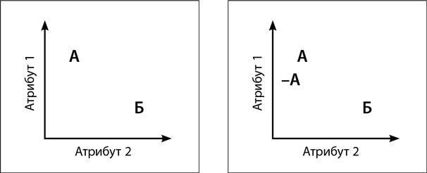В левой части картинки мы видим два варианта, каждый из которых превосходит другой с позиции определенного атрибута. Вариант А лучше с точки зрения атрибута 1, например качества. Вариант Б — атрибута 2, например красоты. Очевидно, что эти два варианта в значительной степени различаются, и выбор одного из них представляется не таким простым делом. Давайте представим себе, что случится, если мы добавим еще один вариант под названием –А, или «минус А» (см. правую часть иллюстрации). Этот вариант очевидно хуже, чем вариант А, однако схож с ним. Это не только упрощает сравнение между ними, но и дает основания предполагать, что вариант А лучше не только варианта –А, но и варианта Б.