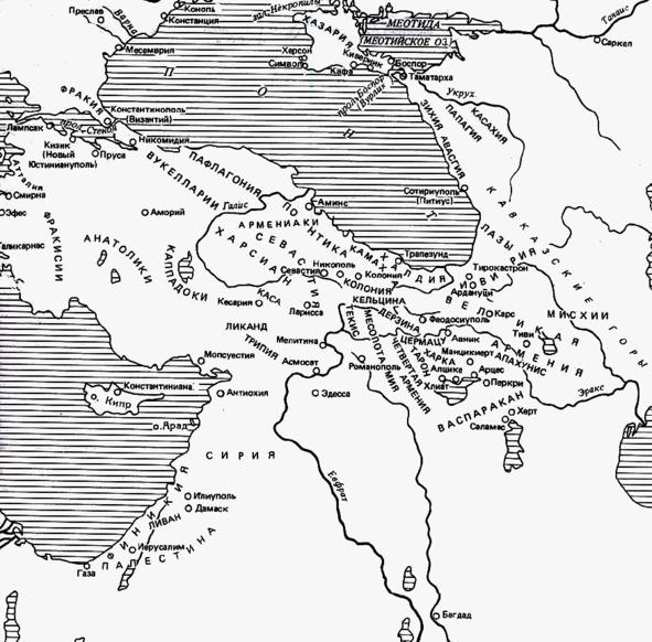 «33. Все эти города занимаются торговлей и населены людьми, выдающимися всем: красноречием, энергией и нравом; климат в этих местах умеренный. Это — лишь часть сведений о Сирии. Мы опустили многое, дабы не казалось, что мы без нужды растягиваем свое повествование, и чтобы описать также другие области и провинции империи».