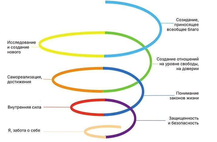 Идеальное отражение своего пути развития я нашла в Спиральной динамике американского психолога Клера Грейвза1, которая объясняет, как развивалось человечество. Я интерпретировала эту динамику в разрезе: как развивается наша психика и что влияет на наше общение.
