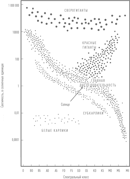 Диаграмма Герцшпрунга–Рэссела. Горизонтальная ось, на которой указаны спектральные классы, соответствует температуре звезд (горячие — слева, холодные — справа). Вертикальная — светимости (яркие вверху, слабые — внизу), она выражена в единицах светимости Солнца. Хорошо видны основные последовательности. Они соответствуют различным стадиям эволюции звезд. Важно, что эти последовательности не являются эволюционными треками. Выделяется так называемая главная последовательность, на которой звезда проводит бóльшую часть своей жизни, превращая водород в гелий.