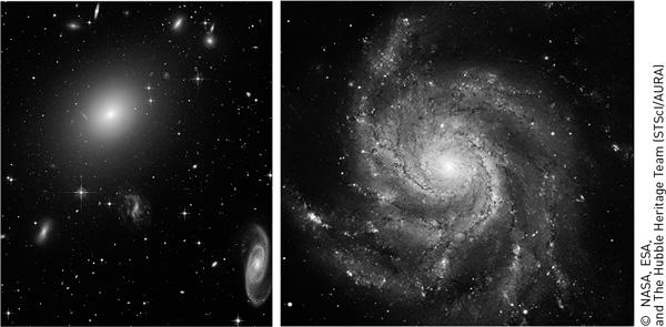 Фотографии эллиптической и дисковой галактик. Эллиптическая галактика ESO 325-G004 входит в состав скопления Abell S0740 (вокруг видно много других галактик разных типов). А дисковая — известный объект каталога Мессье, М101. В эллиптической газ уже практически закончился и процесс звездообразования очень слаб. Ярких массивных звезд, дающих голубоватый свет, там практически нет. В дисковых галактиках газа еще много, и красивый спиральный узор образован в основном яркими молодыми массивными звездами, которые сформировались менее нескольких десятков миллионов лет назад.