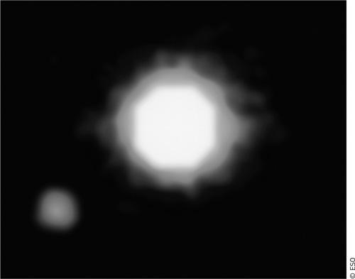 Изображение системы 2M1207, состоящей из экзопланеты (ее обозначают 2M1207b, она слева внизу) и бурого карлика. Это первый в истории прямой снимок объекта планетной массы (несколько масс Юпитера) вне Солнечной системы. Данная экзопланета видна благодаря собственному излучению. За счет продолжающегося гравитационного сжатия недра объекта разогреваются, и мы видим его инфракрасное излучение. То же верно и для некоторых других достаточно молодых планет. Поскольку соседом 2M1207b является бурый карлик — т.е. «недозвезда», в которой не начались реакции превращения водорода в гелий, то иногда ее классифицируют не как экзопланету, а как «объект планетной массы, вращающейся вокруг бурого карлика». Наблюдения проводились на телескопах VLT Европейской южной обсерватории (ESO).