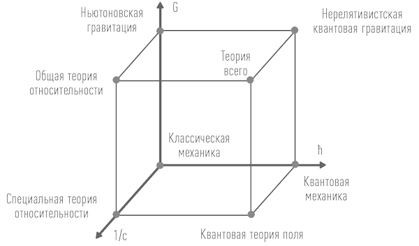 Куб теорий, придуманный Матвеем Бронштейном. Чем дальше мы отходим от начала координат, двигаясь сразу по трем координатам, — тем более разнообразной становится физика.