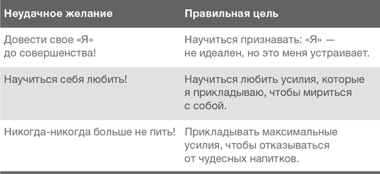 Возможно, вы хотели бы перестать кого-то любить или ненавидеть, избавиться от тяги к алкоголю или наркотикам, излечиться от депрессии, «улучшить» супруга, ребенка или родителя. Но к тому моменту, как вы обращаетесь за помощью к специалисту, уже понятно, что добиться всего этого вы не сможете. Вы не продвинетесь вперед и не получите пользы от лечения, пока не признаете, что ваше желание невыполнимо. А когда вы смиритесь с этим, то превратите свою проблему в конкретную посильную задачу.
