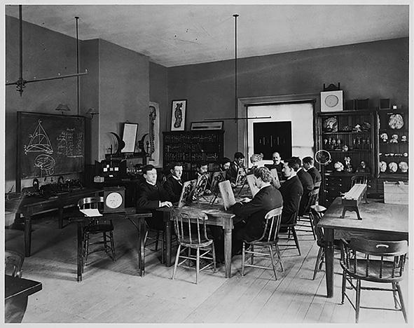 В этом движении можно выделить два основных направления. Первое — это собственно измерение физических (наблюдаемых) величин учебного процесса. В лаборатории Вильгельма Вундта (1832–1920) в Лейпциге для измерений использовались самые различные инструменты — от простого таймера до тахистоскопа, суперсовременного в то время аппарата, позволявшего проецировать изображение в течение определенного времени, чтобы замерить, например, скорость распознавания этого изображения. На фотографии 1892 года Гуго Мюнстерберг (1863–1916), ученик Вундта, проводит исследование — выясняет, сколько времени студенты Гарвардского университета тратят на выполнение учебных заданий (рис. 1).
