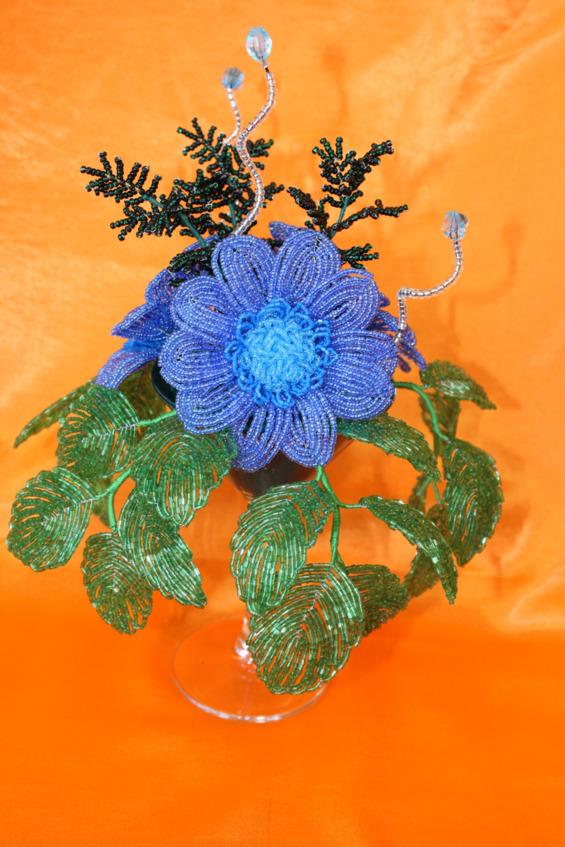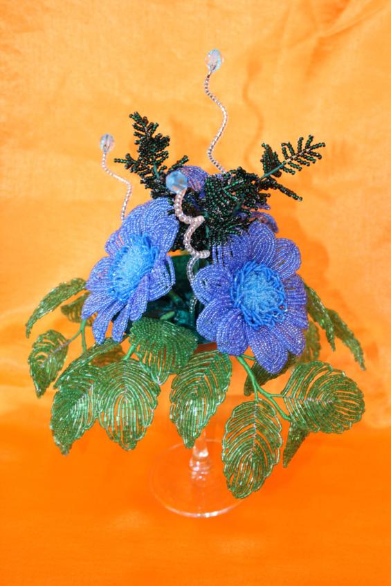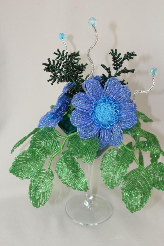 Материалы: бисер №8, рубка зелёная, голубой и синий бисер №12, голубая рубка, ситечко 2,5 см., зелёный бисер в цвет зелёной рубки, пряжа хлопок, проволока 4 мм., проволока 2 мм, бокал высотой 15 см., бисер №6 прозрачный с серебряной серединой, бусины 3 шт. 10мм.