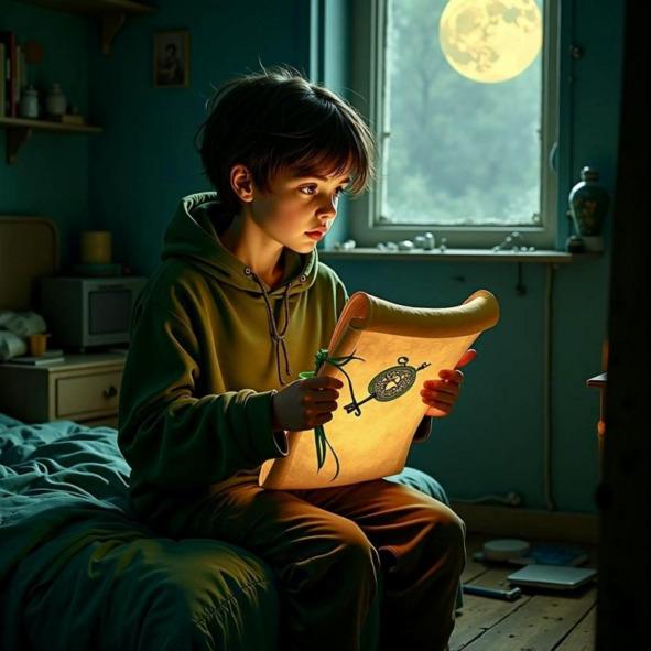 На полу, у его кровати, лежал свиток. Не конверт. Не письмо. И именно свиток. Связанный зеленой лентой, как молодая ветвь. На нем — печать в виде ключа с рогами, словно нарисованная дрожащим от ветра пером.