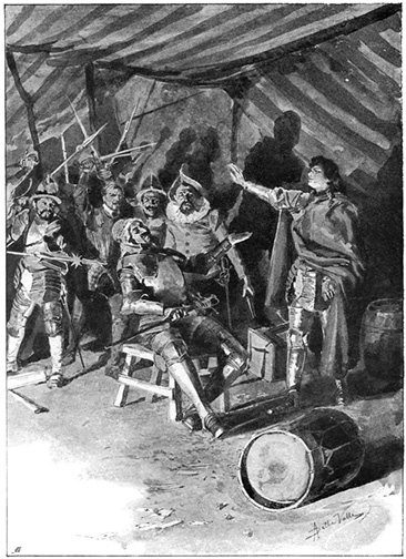 Капитан, то и дело разражаясь проклятиями, успел снова проиграть с полдюжины цехинов. Тут полог палатки откинулся, и появился новый персонаж; он был закутан в длинный черный плащ, на голове — изящный небольшой шлем с тремя синими перьями. Он произнес с иронией: