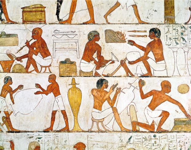 [16] Настенные рисунки из гробницы Рехмира изображают процесс полировки и гравировки ваз. Египет, ок. 1567–1320 гг. до н.э., Долина Знати, Фивы, Египет / BAL