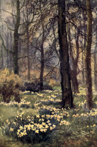 To the north of the Palace—reached by a gate in the wall of the Long Walk, or first seen by those who come to Hampton Court Palace through the Lion Gate—is the Wilderness, a half-cultivated place contrasting greatly with the parts of the grounds that we have already been visiting. Here are tall trees of various kinds, massed shrubs, and broad stretches of turf spangled with daffodils and other bulbs in the spring; within it is a smaller wilderness overlooked by many visitors forming a kind of wild garden, its many flowers growing upon the rocky banked sides of the tortuous paths, with groups of slender bamboo, flowering shrubs and brambles,—a place which is particularly fascinating in the late springtime.